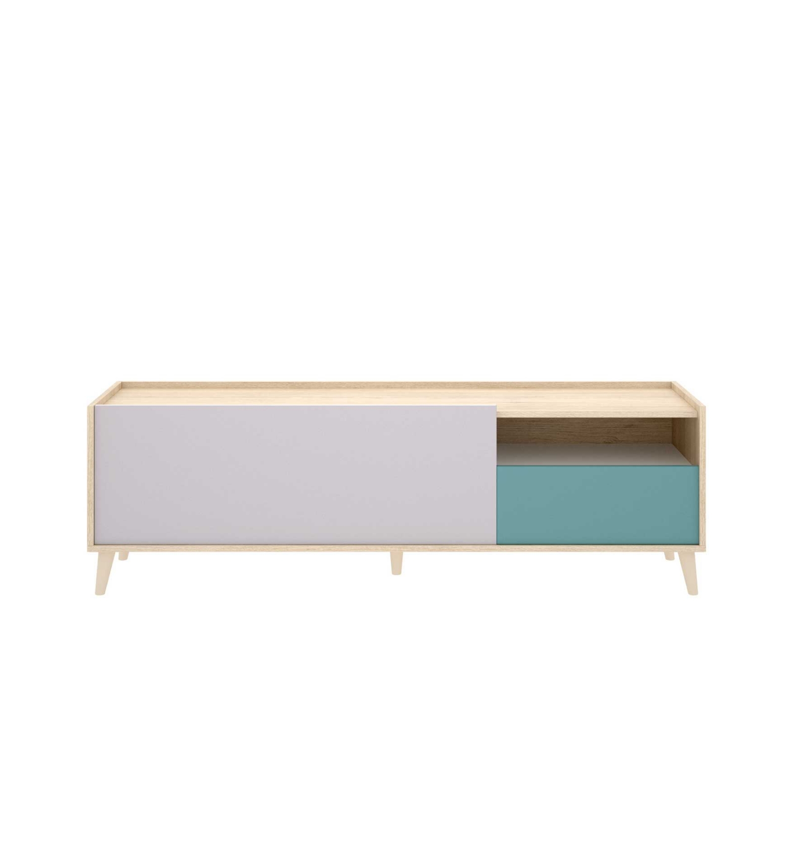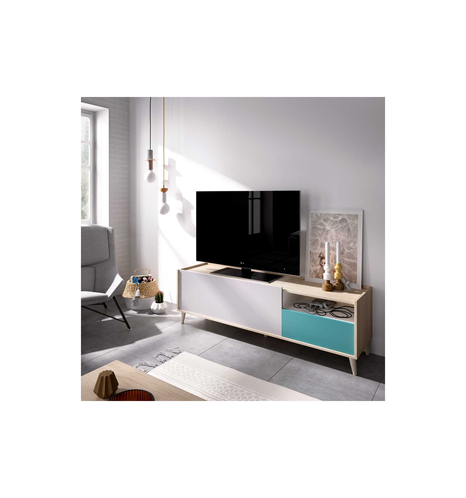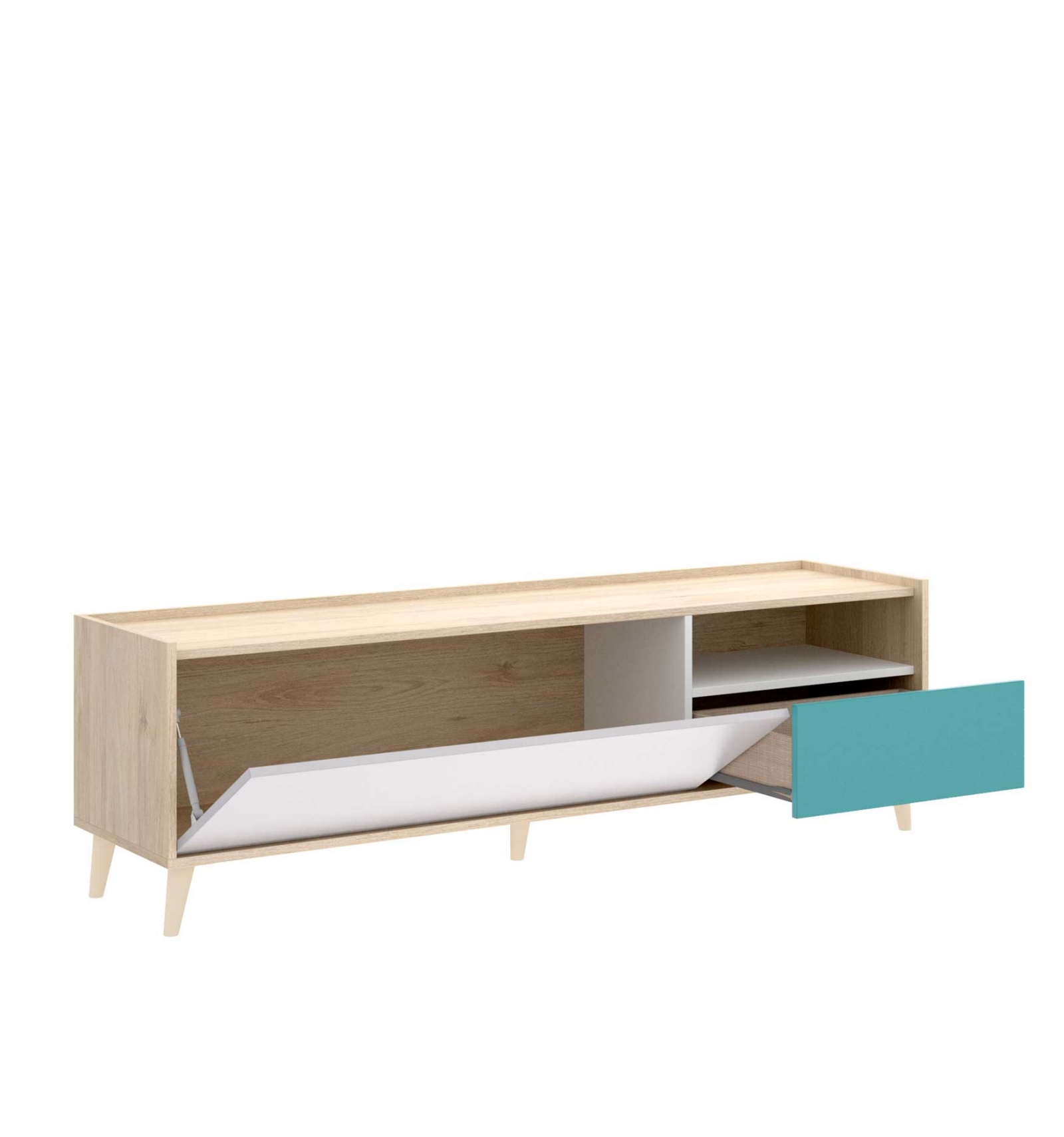 El estilo retro vuelve con fuerza con el mueble de TV POP. Este mueble para TV de color esmeralda y blanco cuenta con 1 cajón y una puerta que reposa sobre 4 patas color madera natural. Además cuenta con un gran espacio de almacenaje con nicho y cajón.