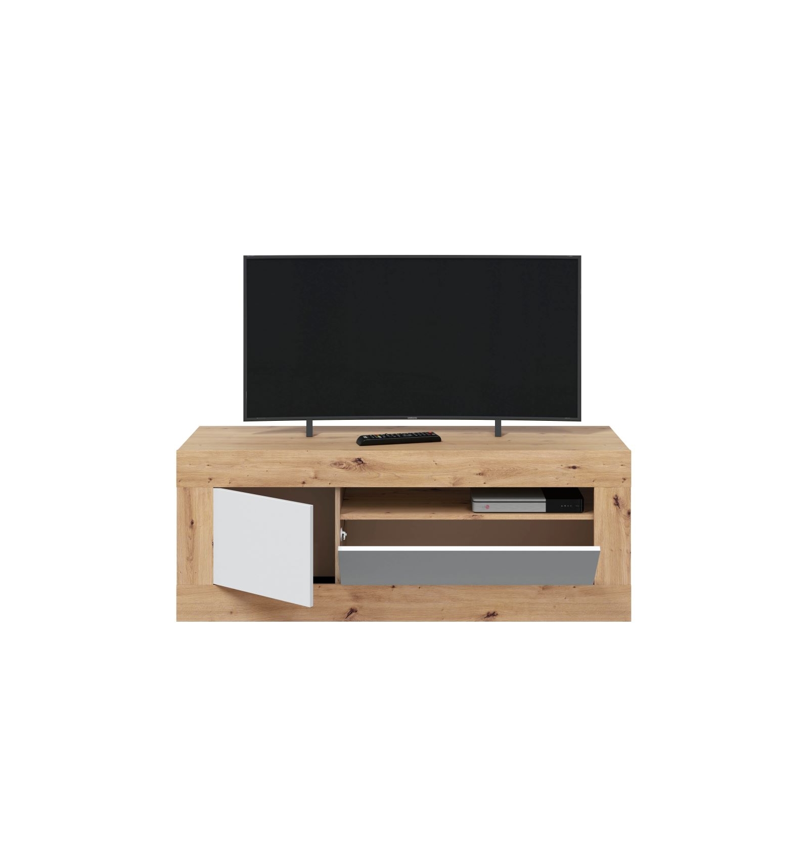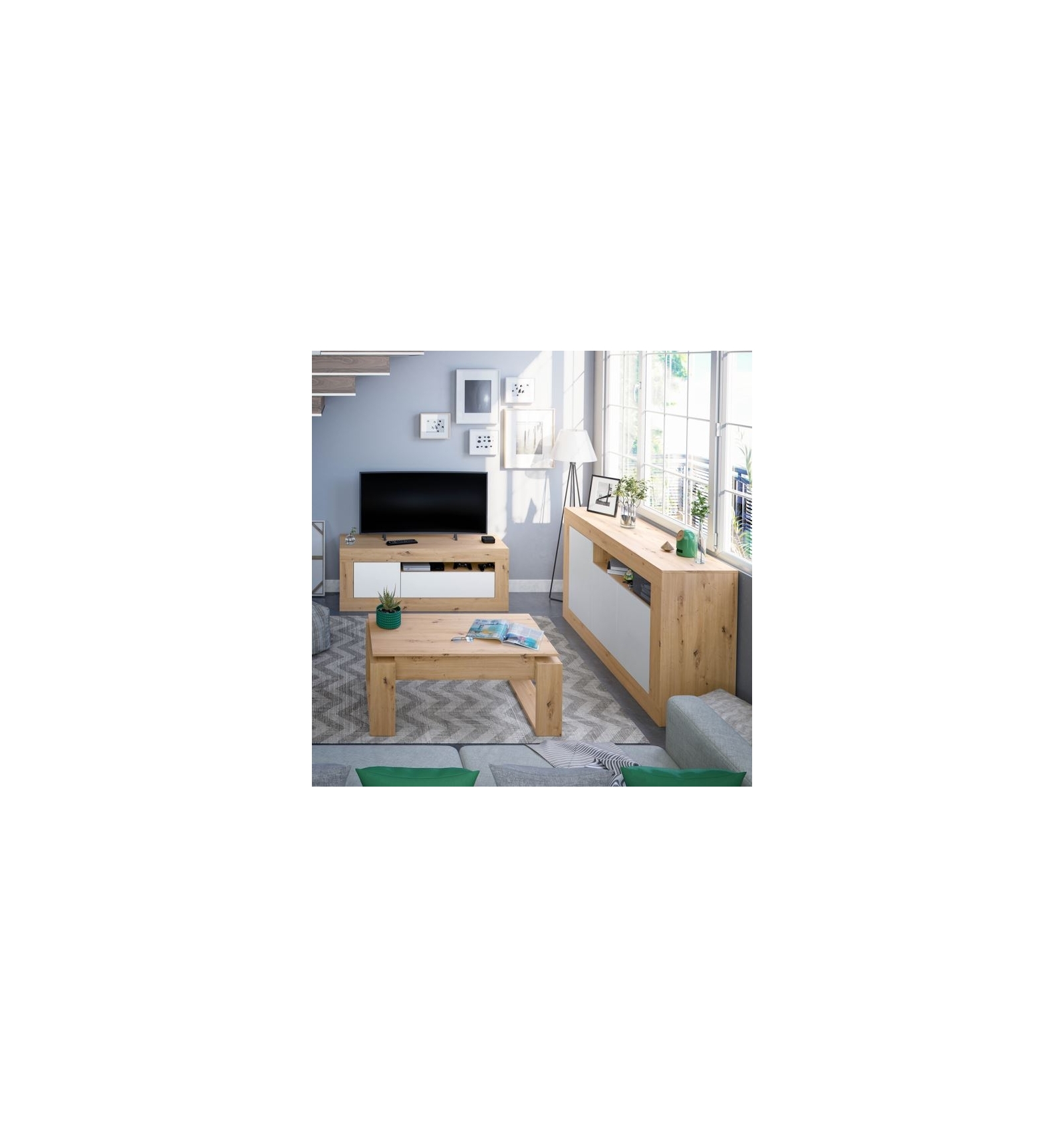 El mueble de televisión Petra destaca por su diseño de líneas rectas, su combinación de tonos roble y blanco y su tamaño, perfecto para cualquier salón.
