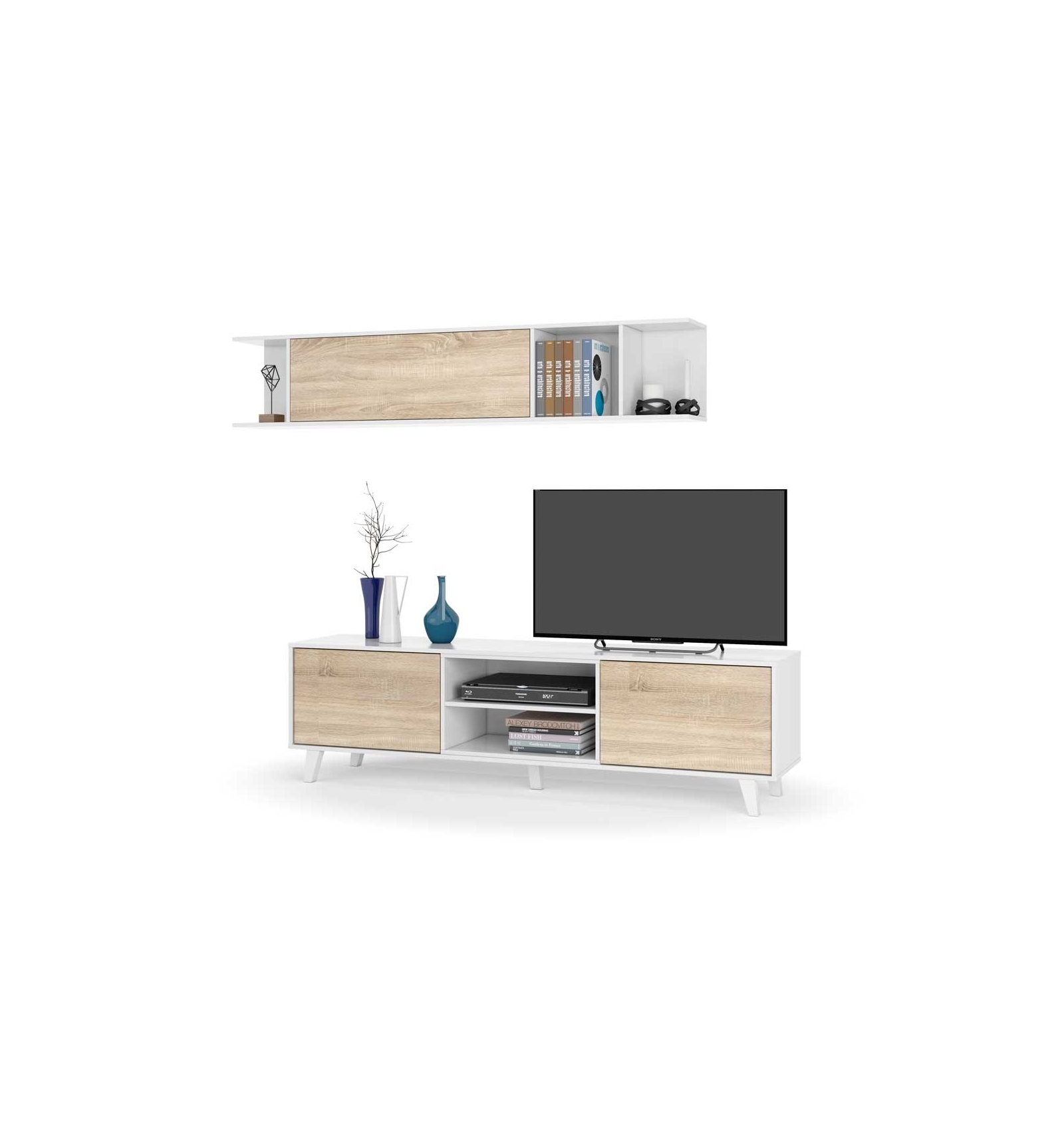 El módulo inferior cuenta con 2 espacios laterales de almacenaje cerrados con puertas y un espacio central abierto con estante central, ideal para colocar aparatos electrónicos como el DVD, la videoconsola, etc. El módulo superior del mueble de televisión de estilo nórdico Emori está diseñado para ser colgado en la pared y cuenta con una puerta central batiente que se abre hacia arriba y 3 estantes laterales a la vista ideales para poner objetos decorativos o libros.
