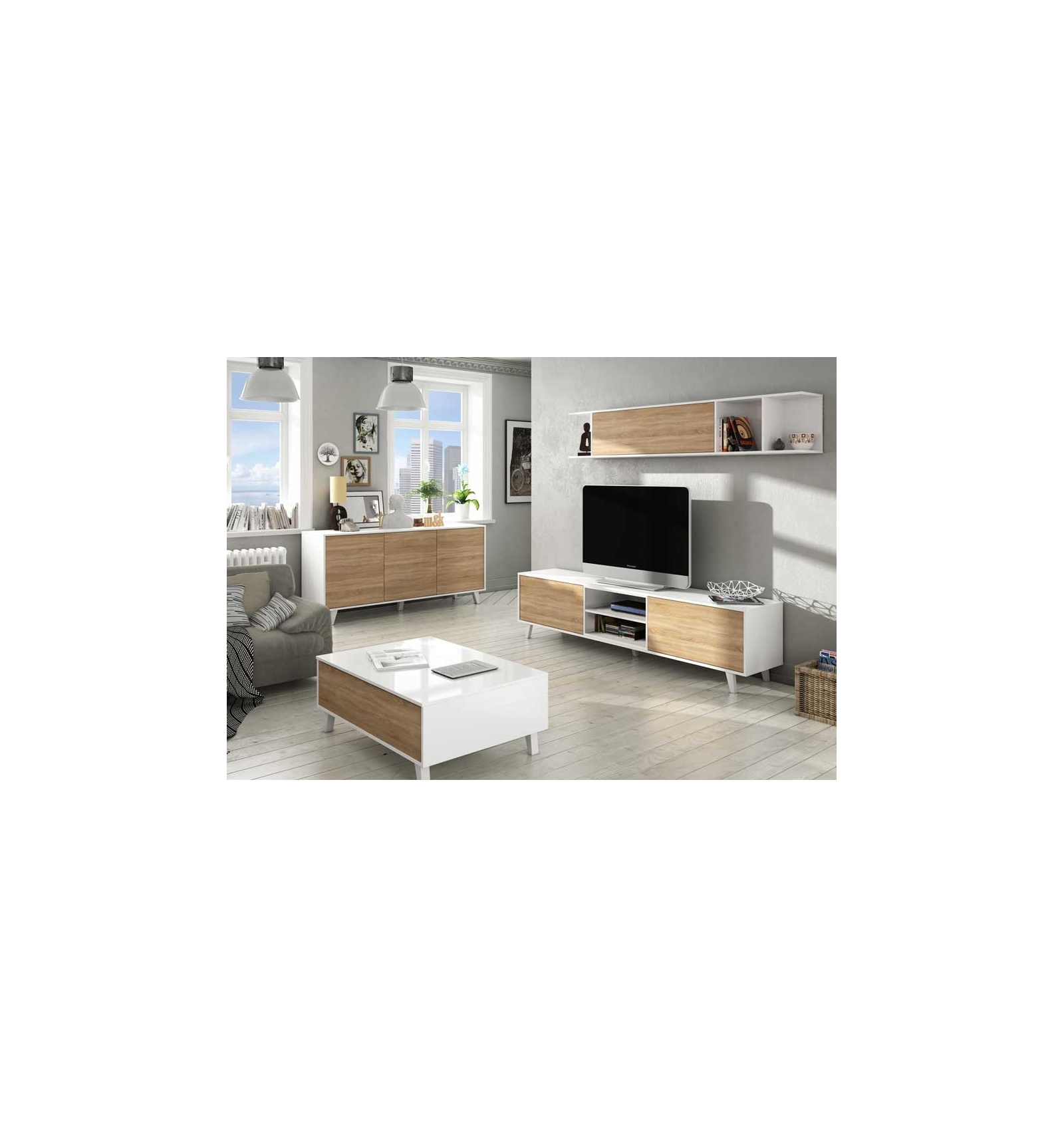 El mueble de televisión de estilo nórdico Emori está fabricado en melamina de alta calidad y ofrece perfectos acabados que combinan el blanco brillo con roble, aportando gran luminosidad a la estancia.