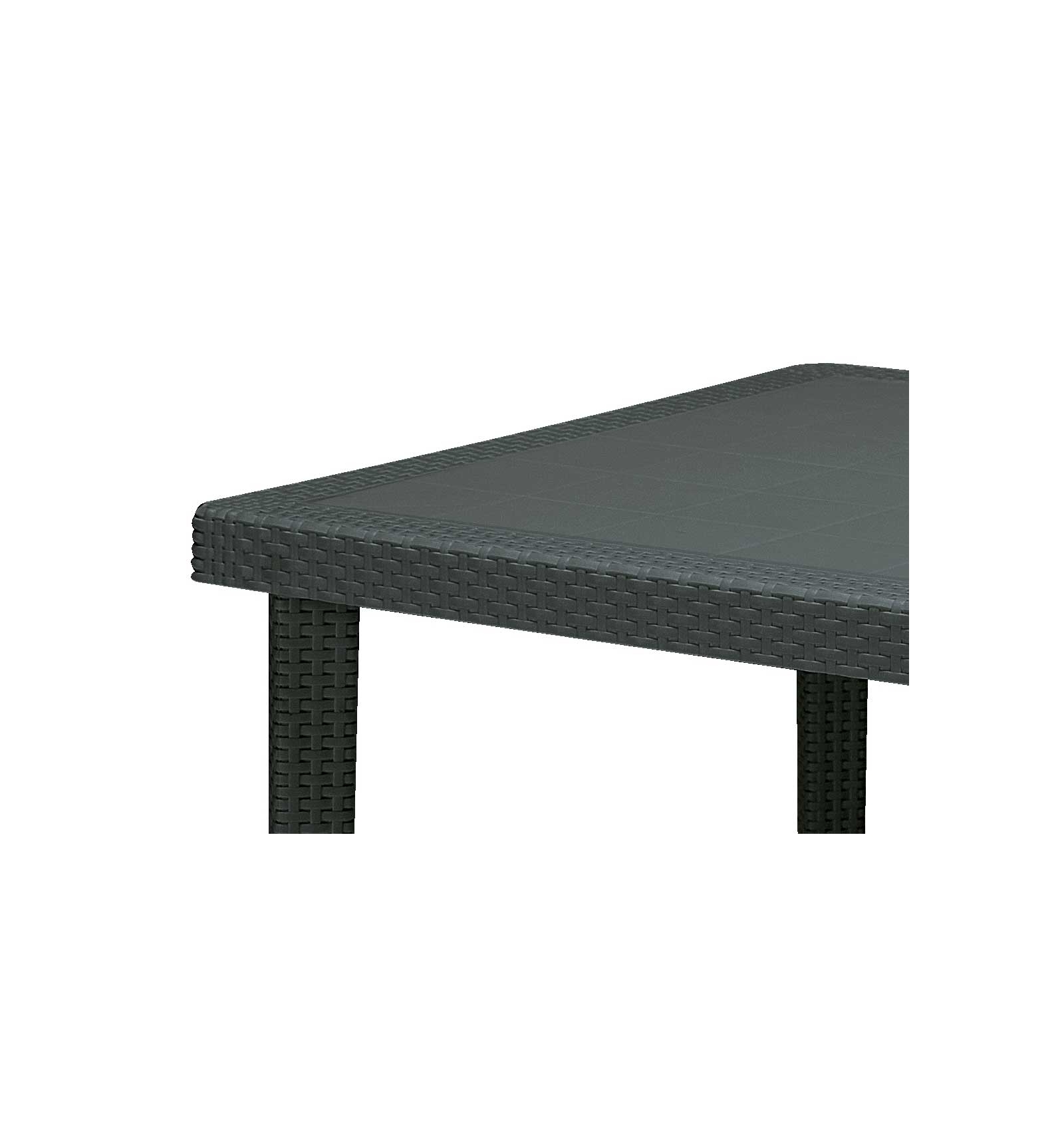 Esta mesa fabricada con polirratán de alta calidad te permite tenerla en el exterior sin preocuparte por su desgaste. Está hecha en un material muy resistente al uso y a los rayos de Sol. Además, tiene una estructura rígida y compacta. Puedes complementarla con cualquiera de nuestras sillas.