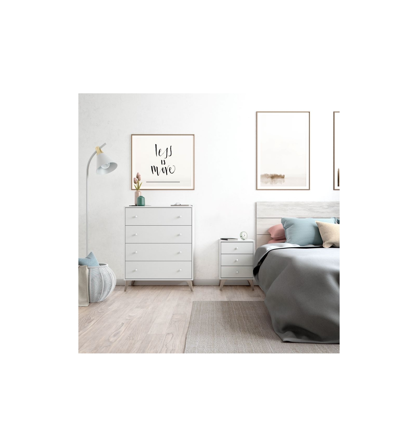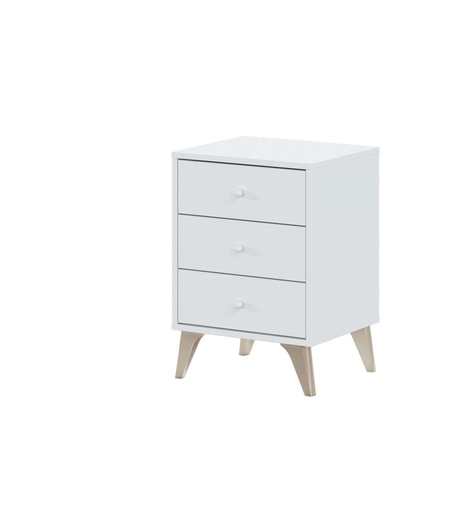 Tiene un acabado en color blanco con tiradores ABS en forma de bola. Los cajones cuentan con guías metálicas (no extraíbles).