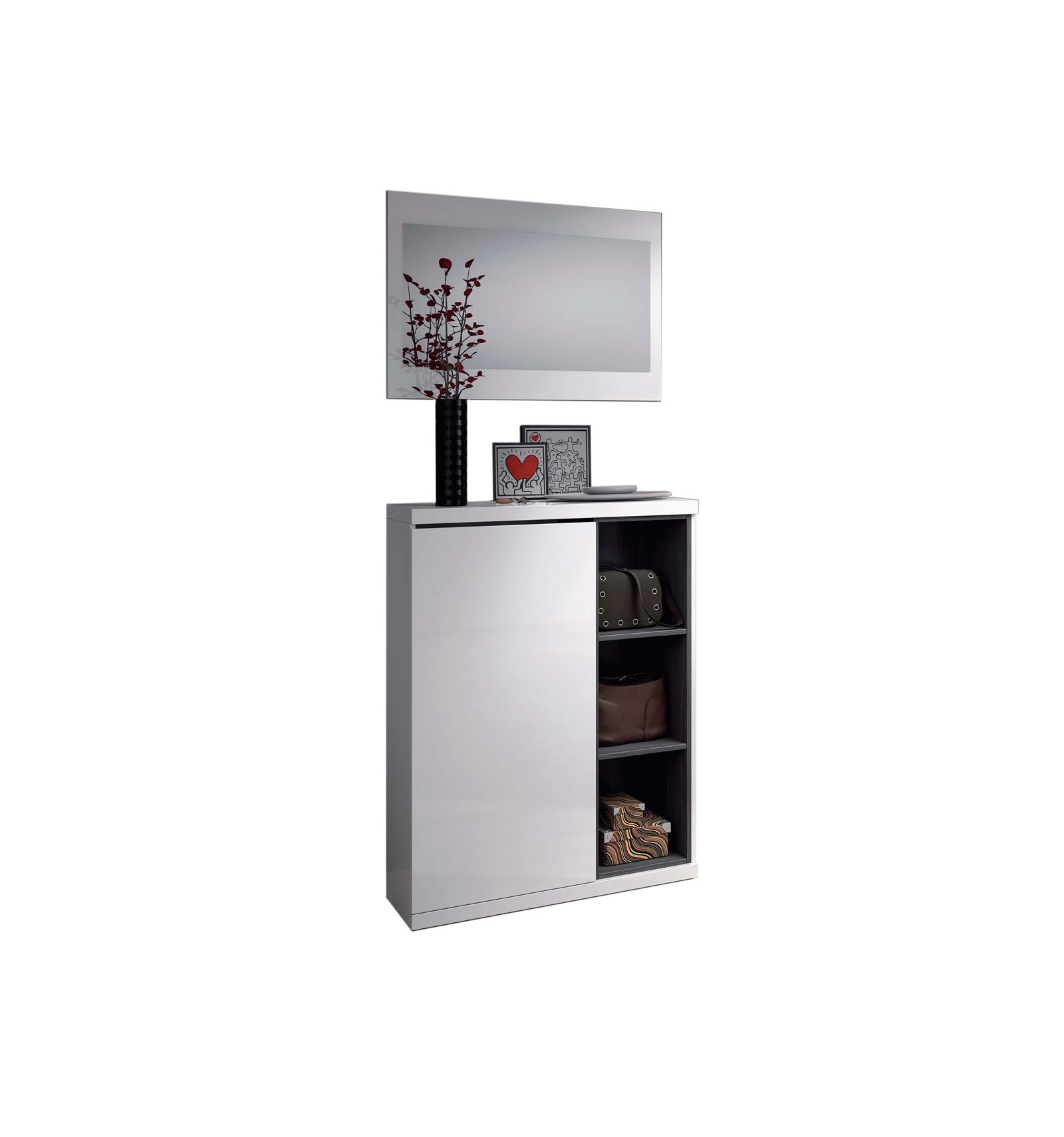 Carl se compone de un armario zapatero en color blanco y con capacidad para 9 pares de zapatos, 3 estantes laterales en color gris con un tamaño perfecto para dejar tus bolsos o cualquier otro complemento decorativo y un espejo en el que te podrás dar el último retoque antes de salir de casa.