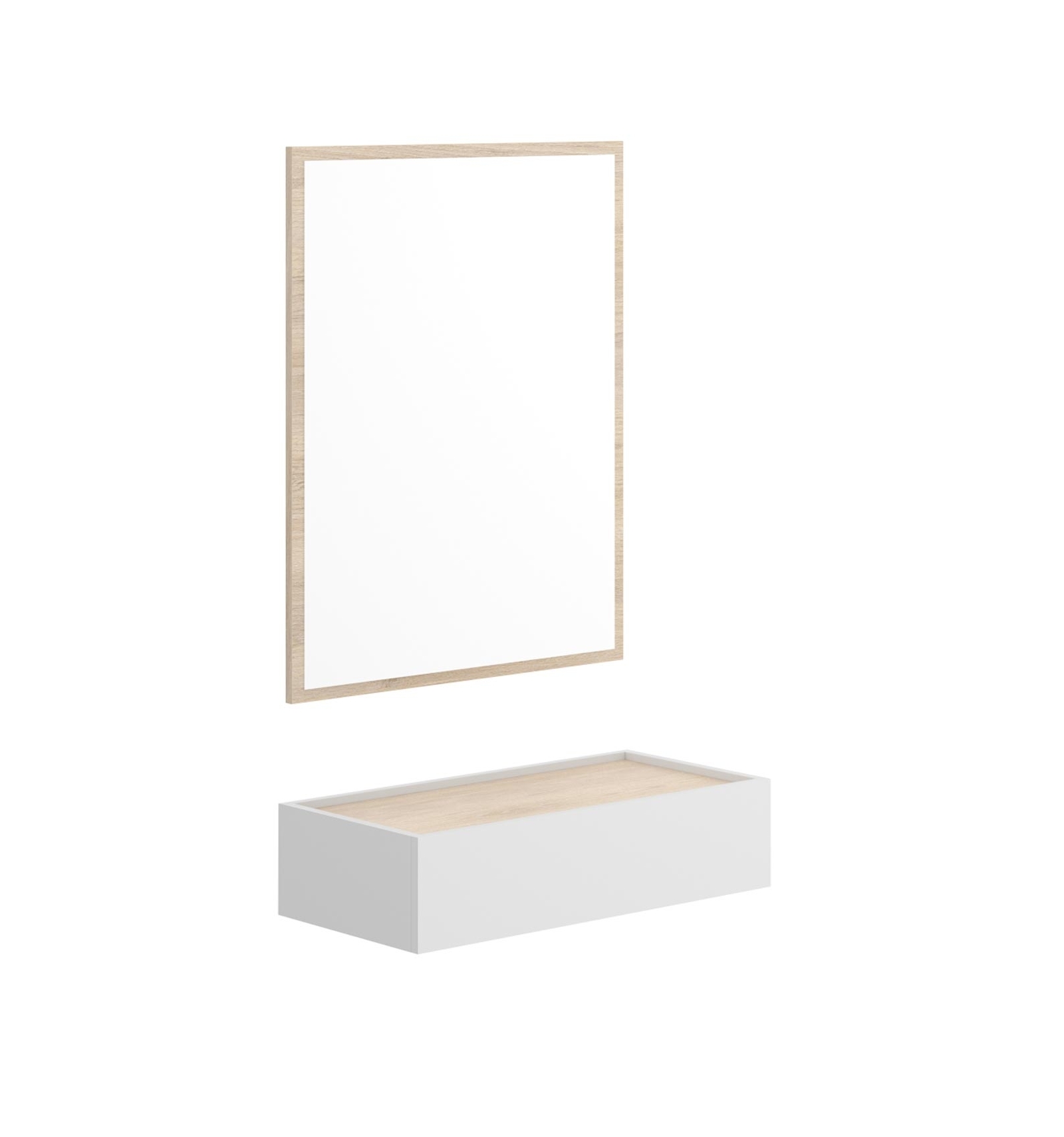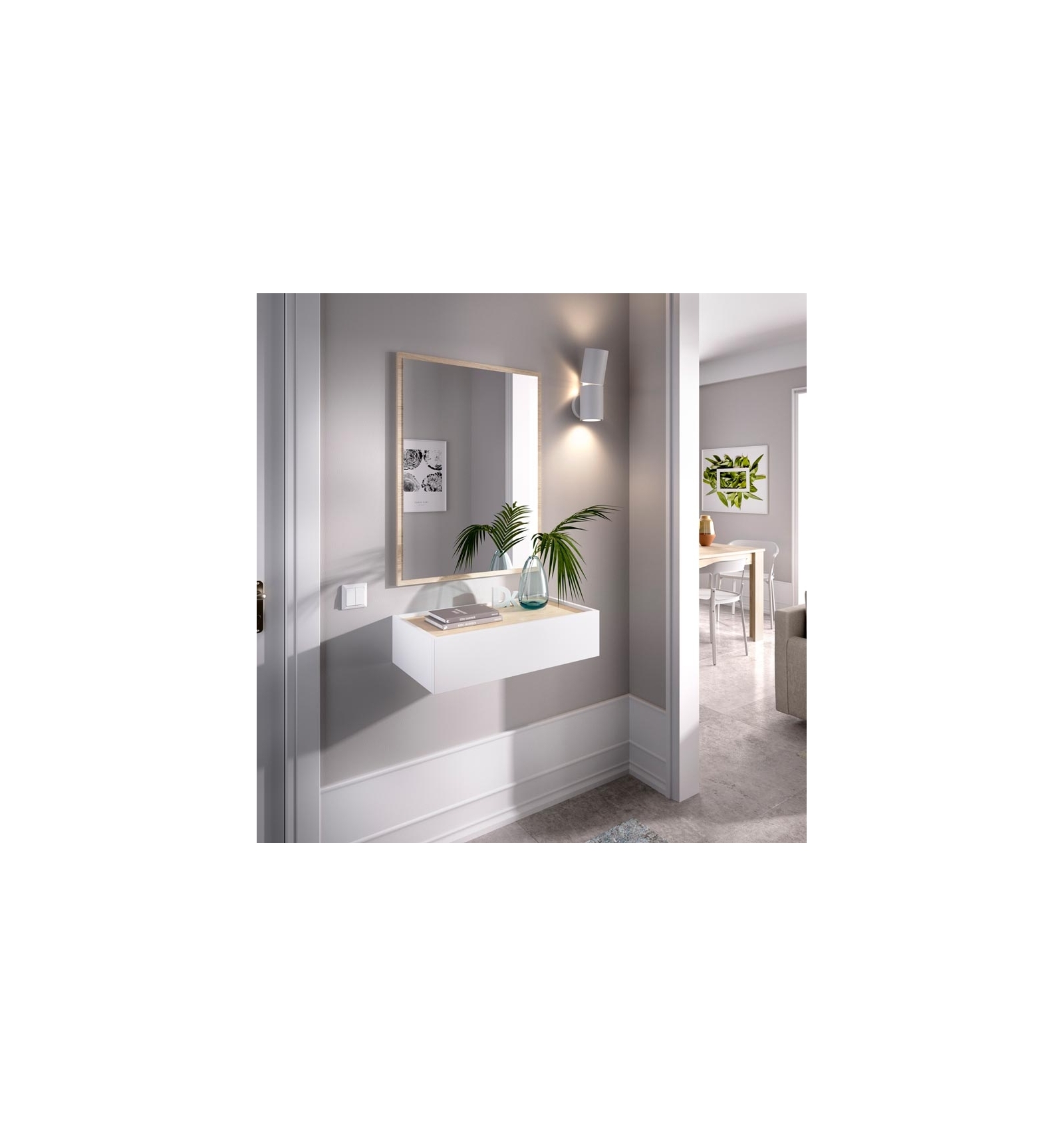 Este recibidor se compone de un espejo de 60 x 80 cm de alto y un práctico cajón de 63 cm de ancho y 33 de profundidad, perfecto para guardar esos objetos que necesitamos tener a mano, llaves, auriculares,…