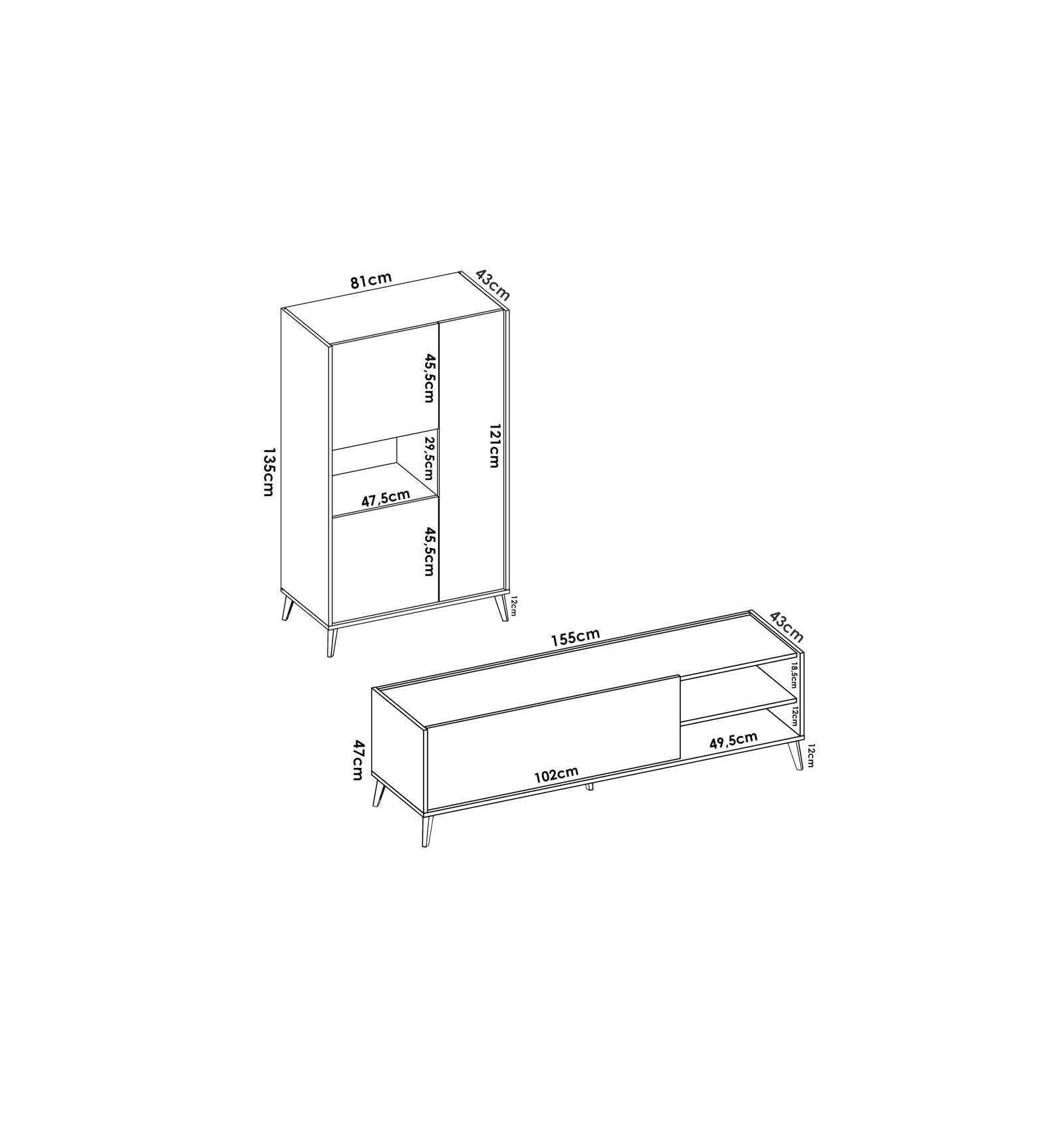 | Medidas: | Módulo Alto: 81 x 43 x 135 cm | Mueble TV: 155 x 43 x 47 cm |