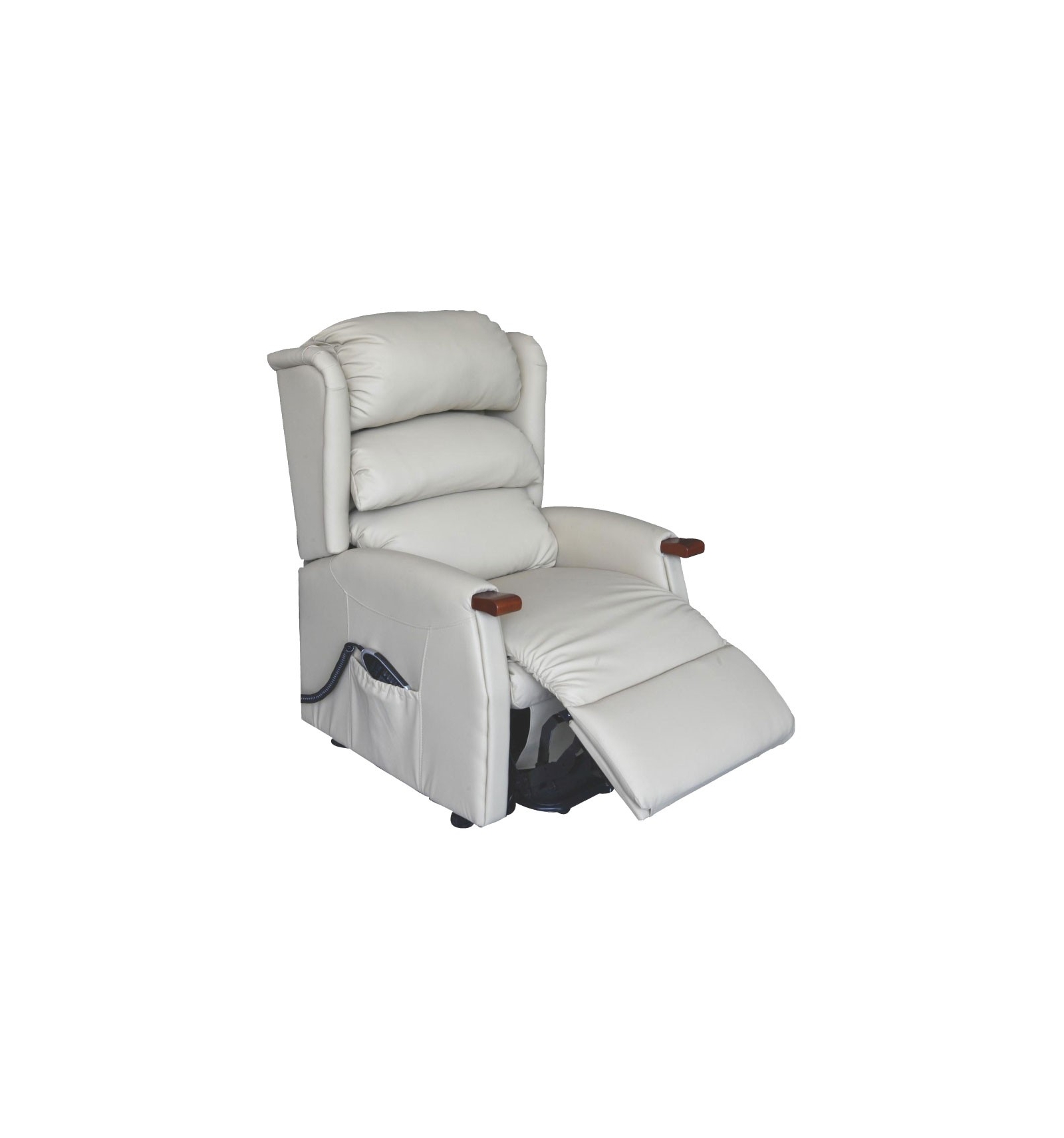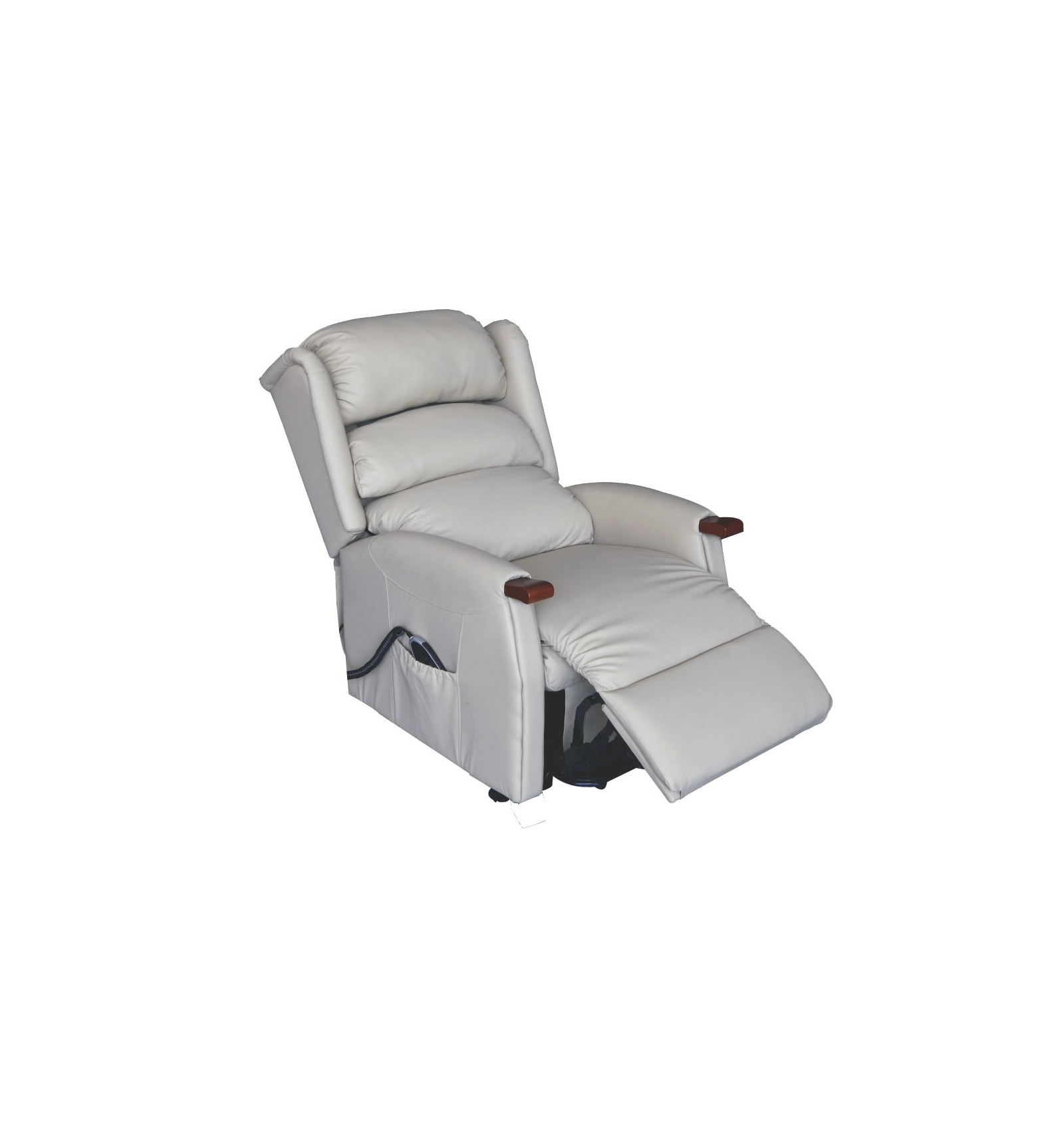 El sillón levantapersonas con 2 Motores Splendor en color beige está tapizado en polipiel y dispone de un bonito detalle en madera en el reposamanos. También dispone de un bolsillo lateral para colocar el mando y el periódico.