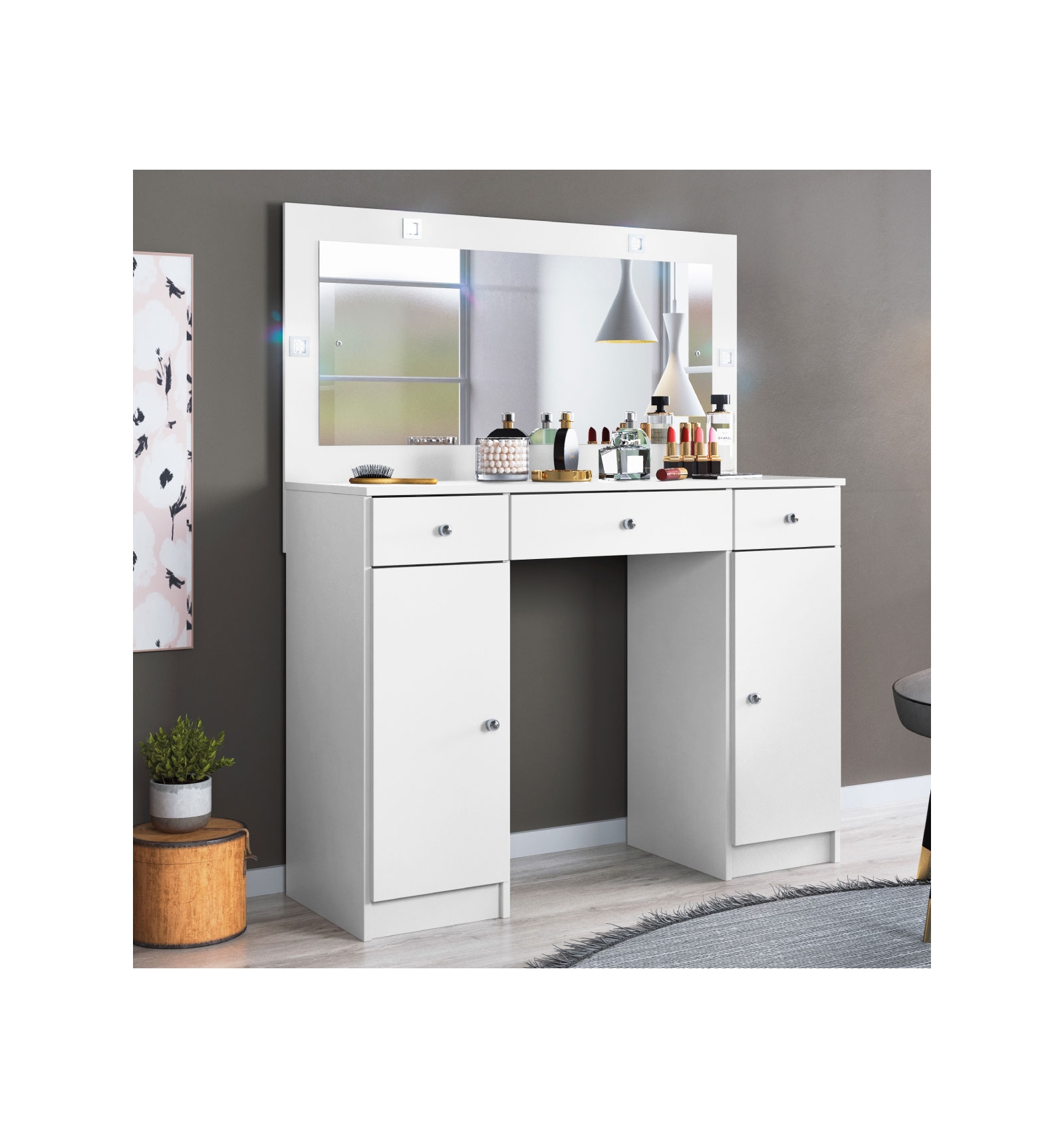 Incluye dos armarios laterales y tres cajones, uno de ellos especialmente diseñado con pequeños compartimentos organizadores, ideal para mantener ordenados todos tus cosméticos, pintalabios, esmaltes de uñas y accesorios para el cabello. Todo estará al alcance de tu mano, listo para cuando lo necesites.