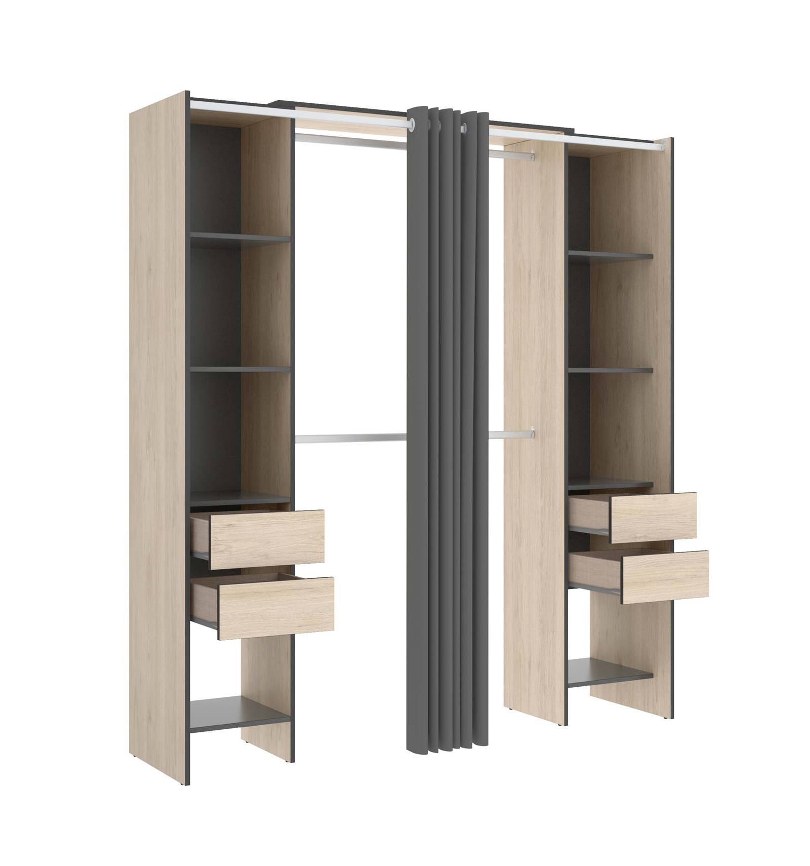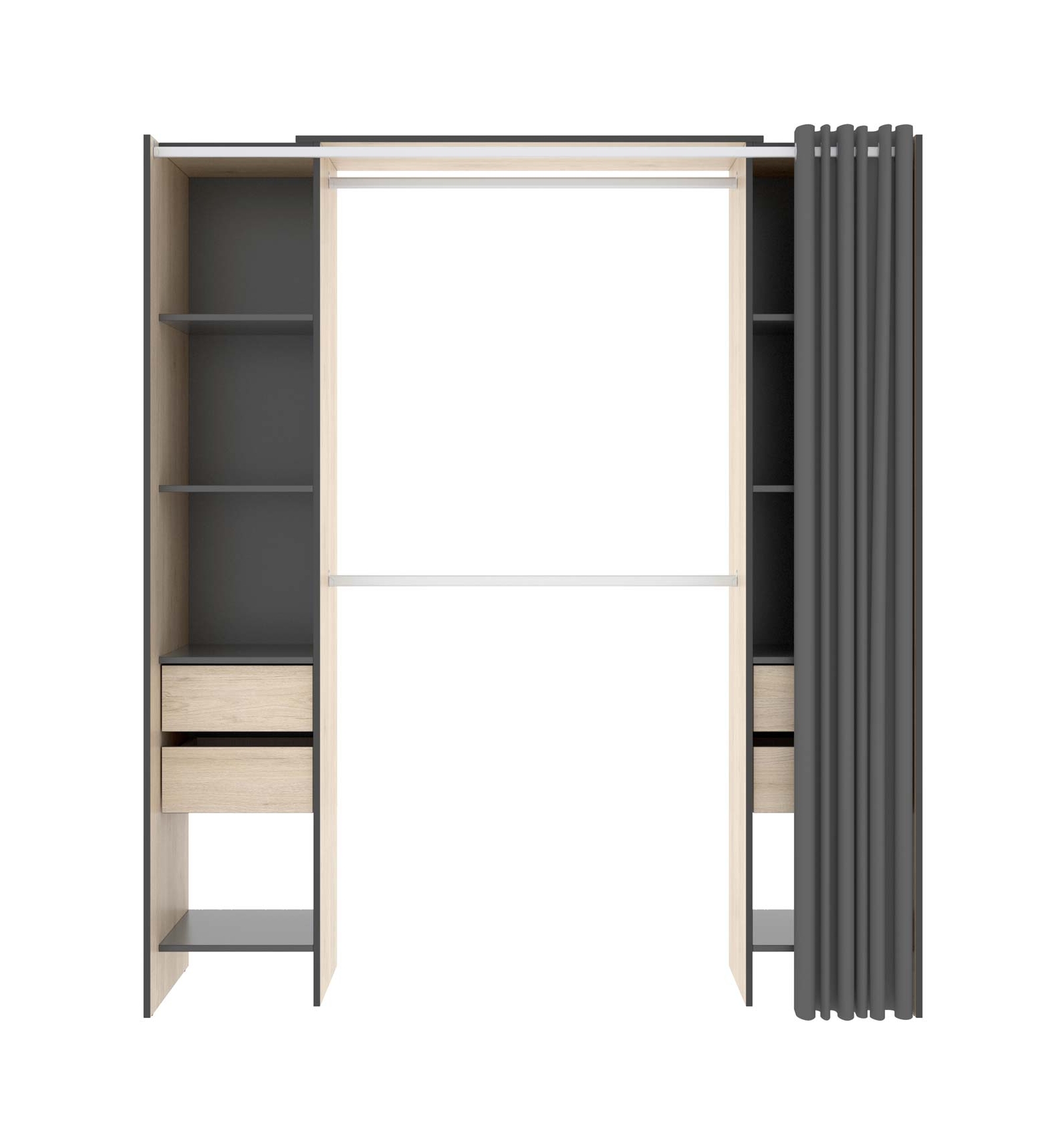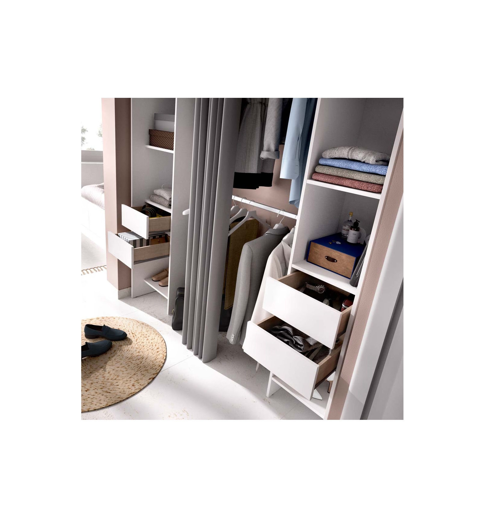 El vestidor abierto con cajones Vesto, está disponible en blanco y que se adapta a cualquier estilo decorativo o si por el contrario quieres dar un toque más moderno, en color grafito /natural.
