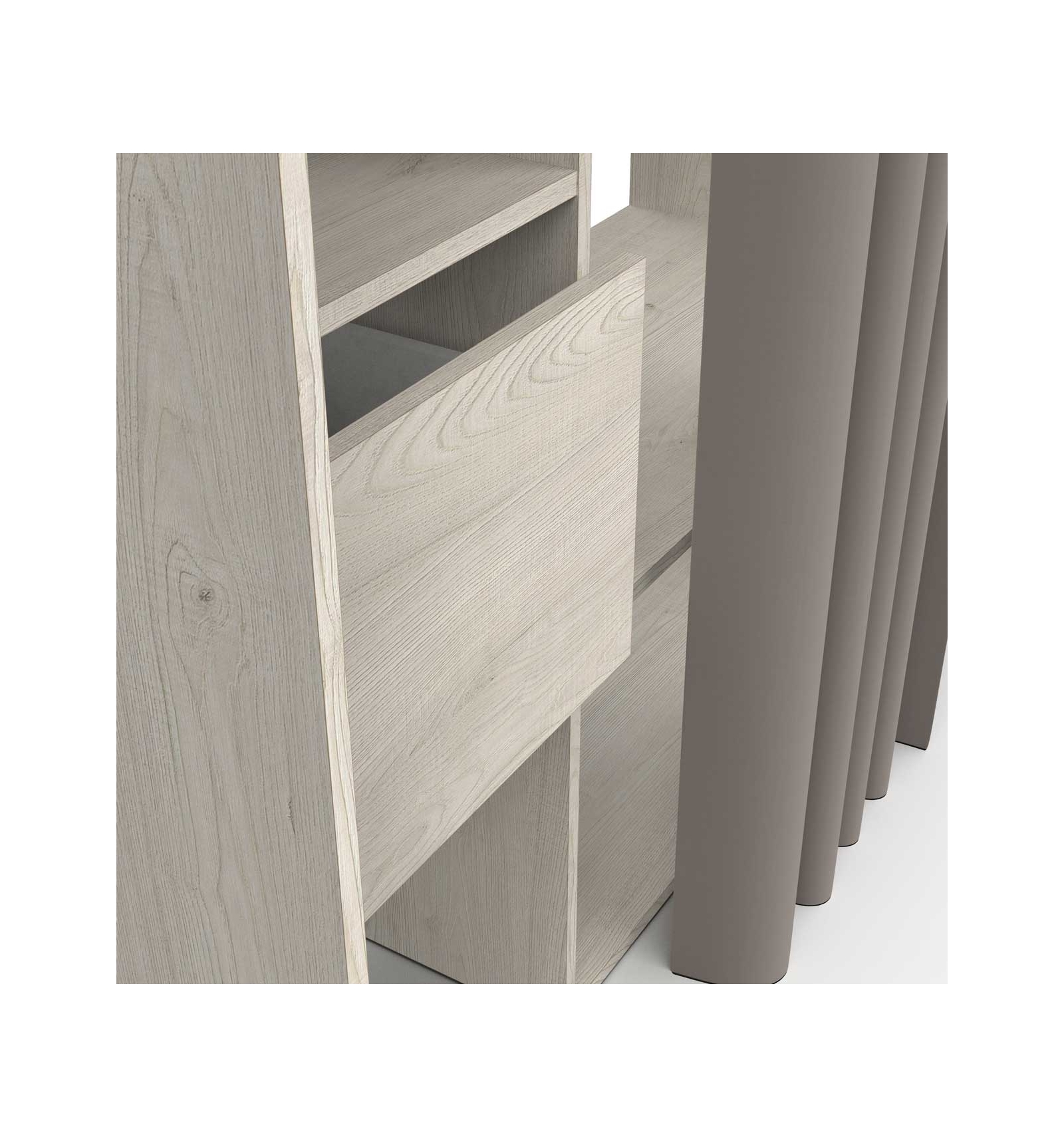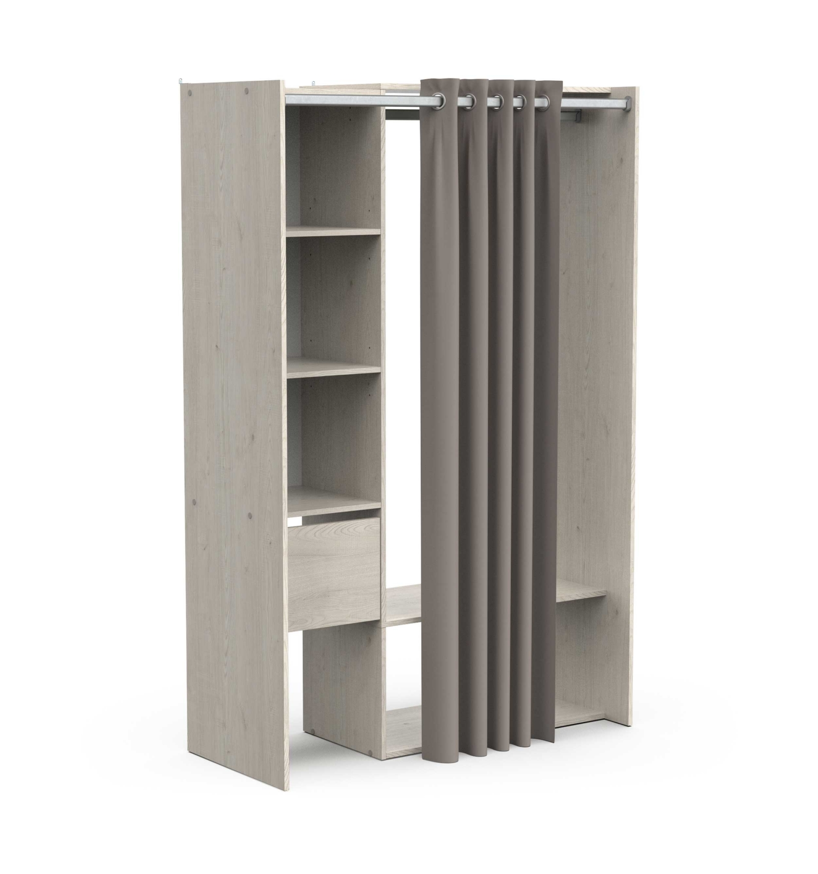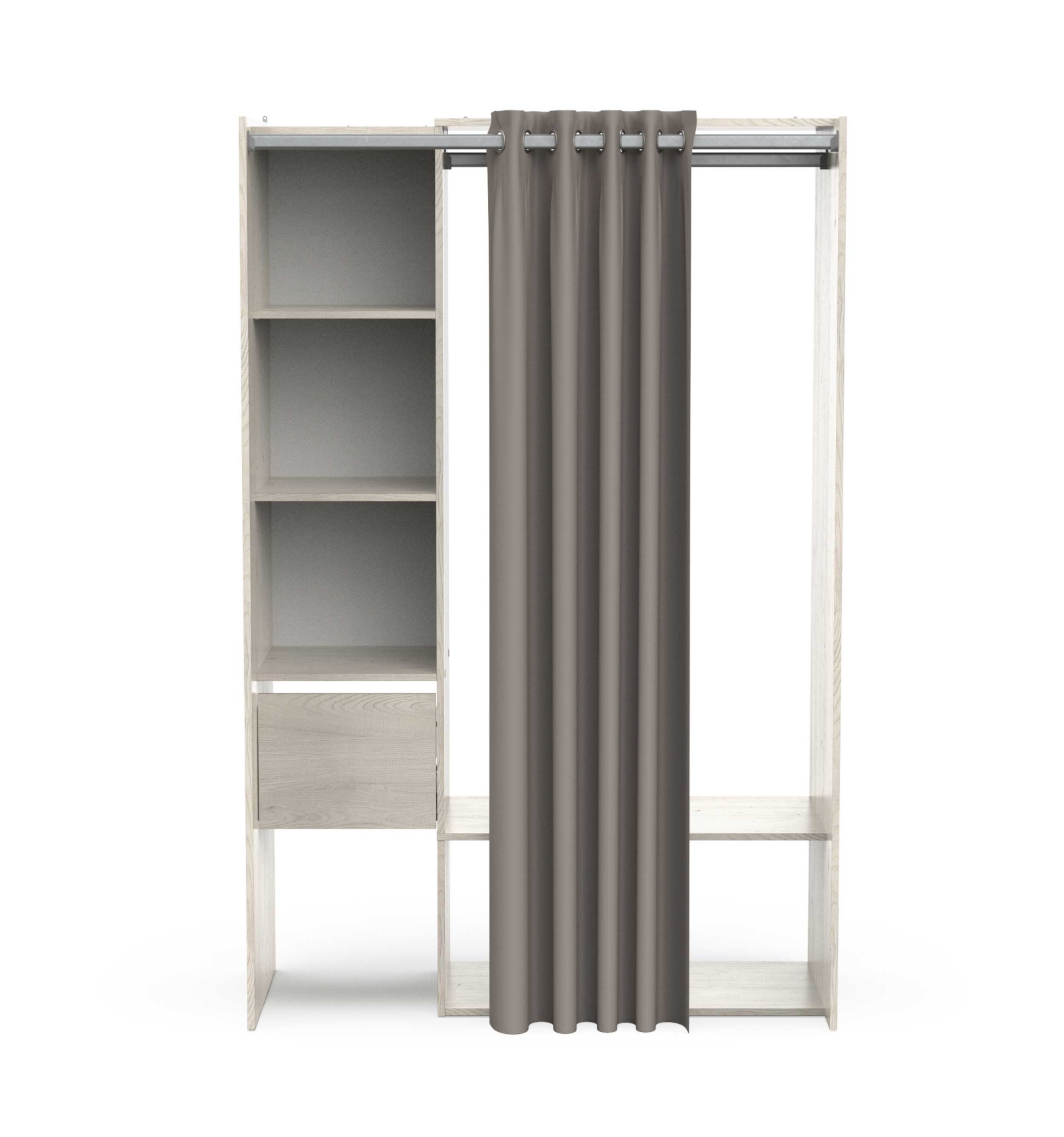 El vestidor abierto con cortinas Randy puede adaptarse fácilmente al espacio pues tiene una medida mínima de 83 cm de ancho y pudiendo extenderse hasta los 120 cm y teniendo más espacio para colgar prendas.