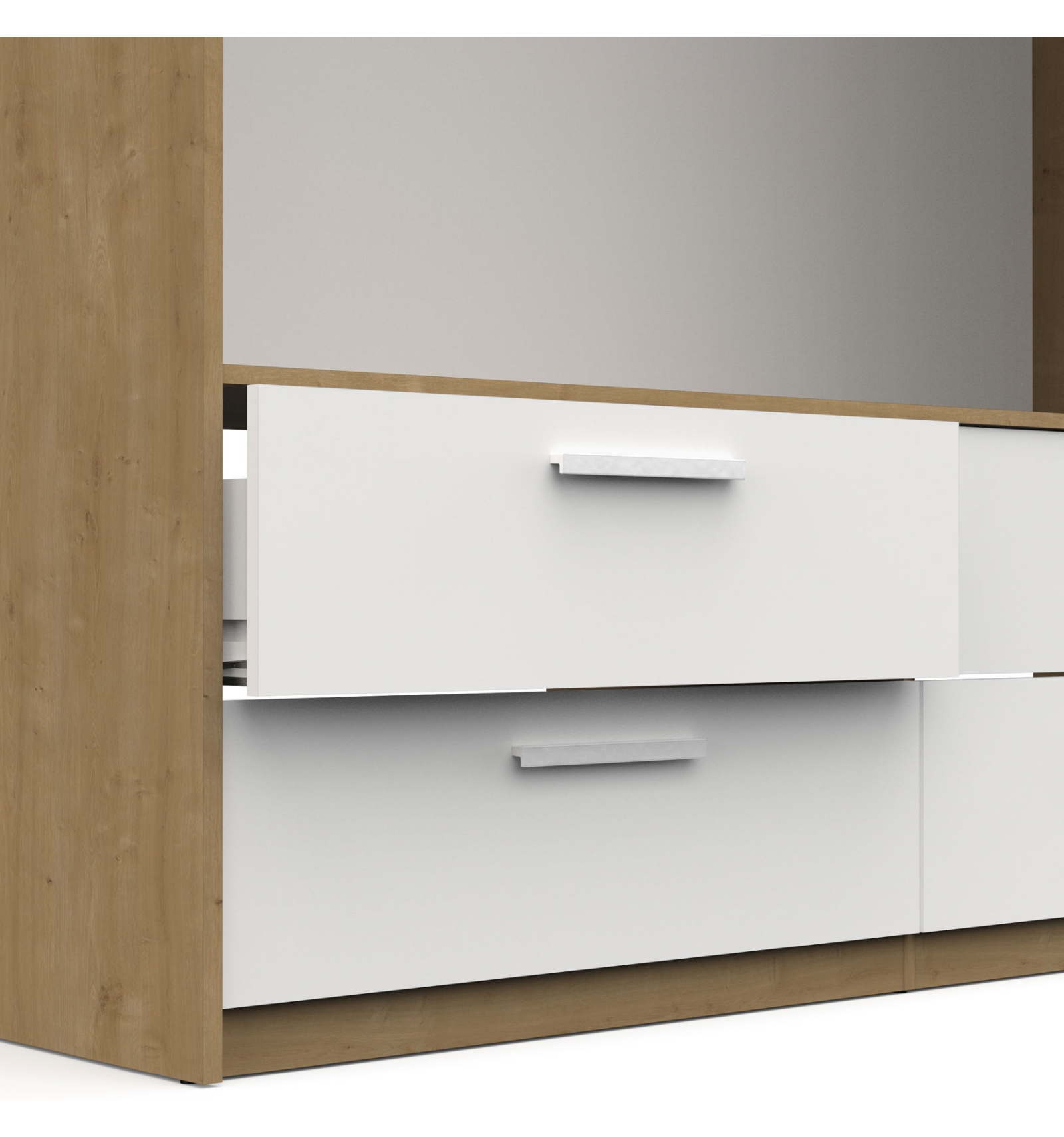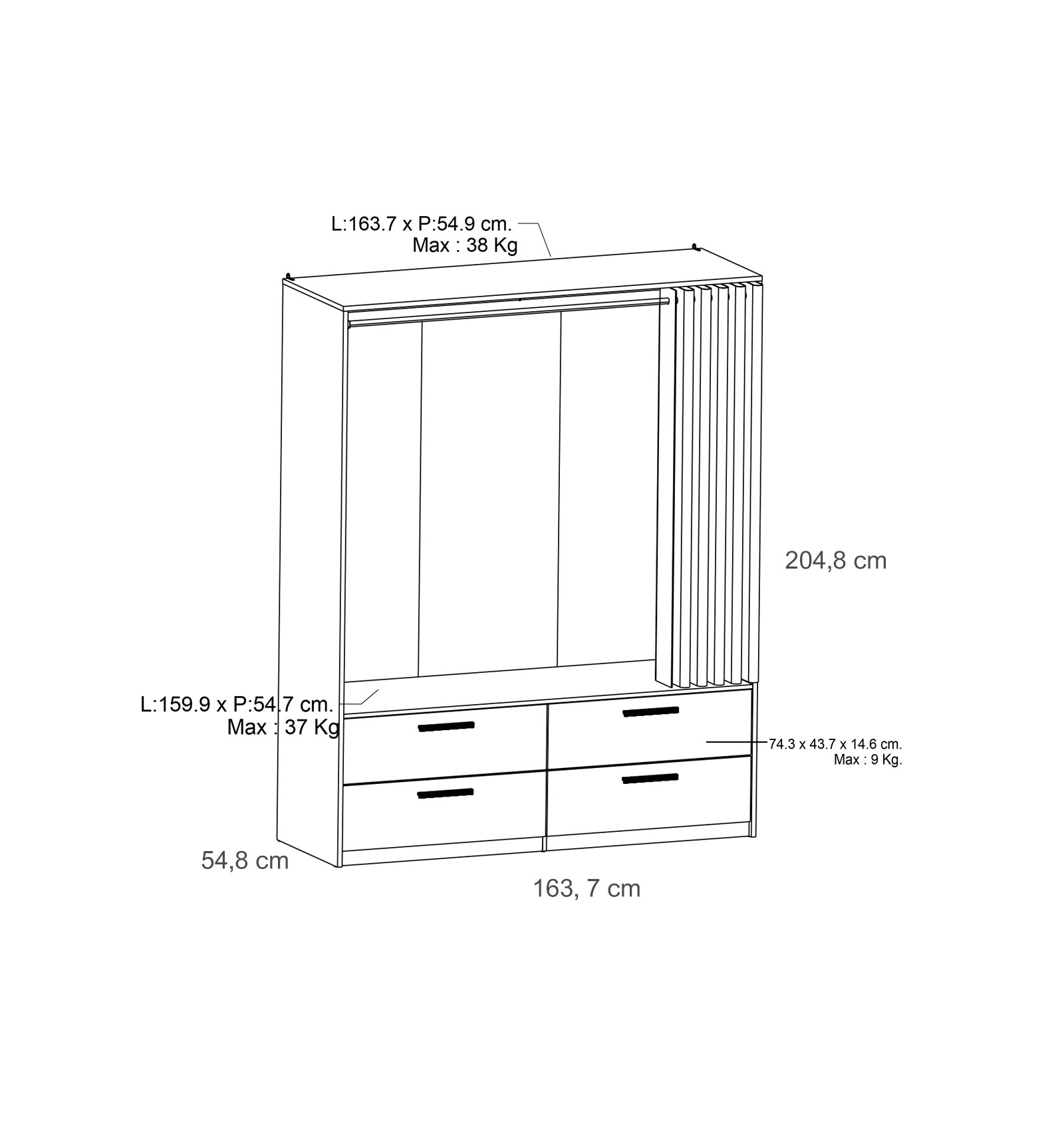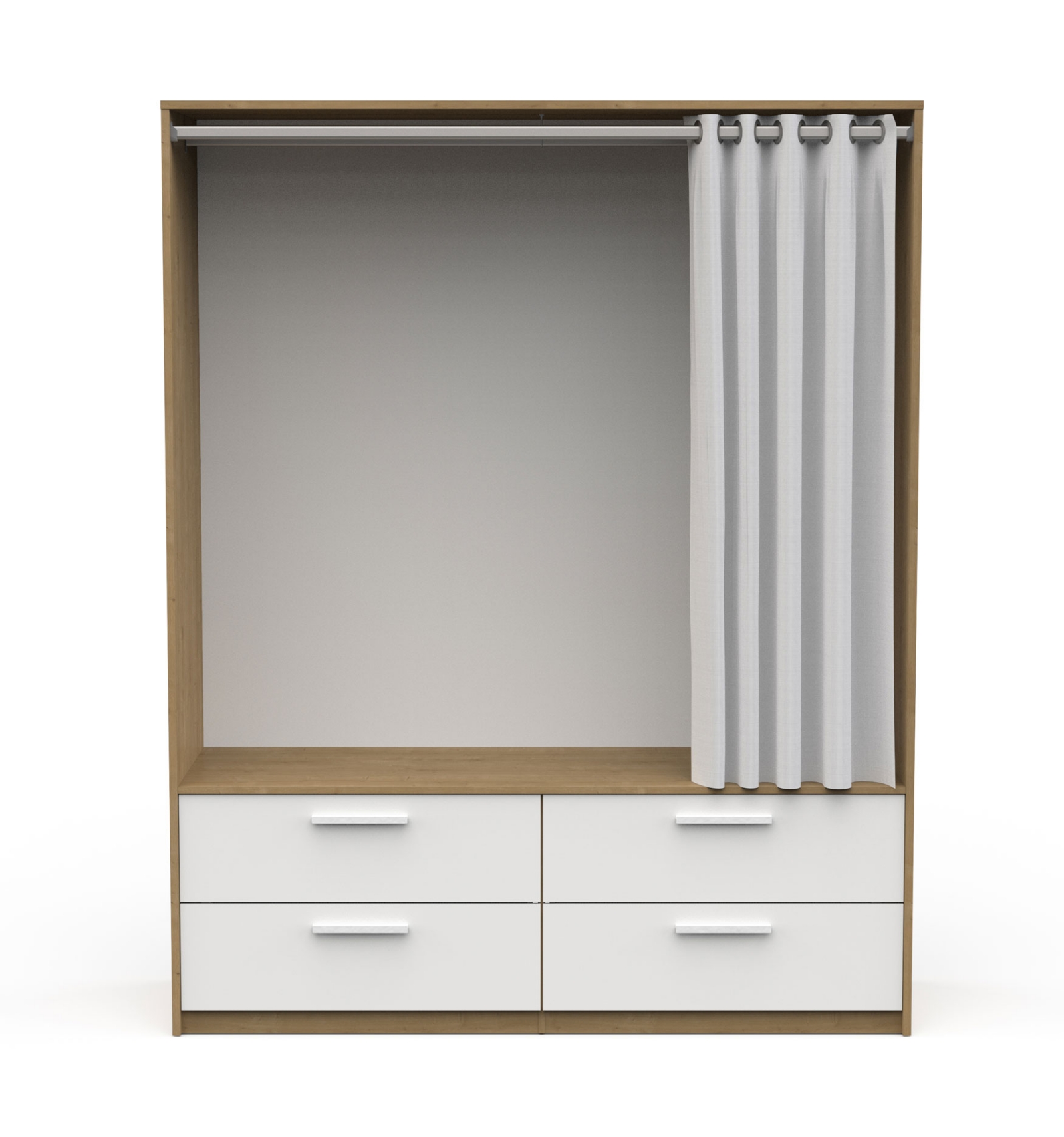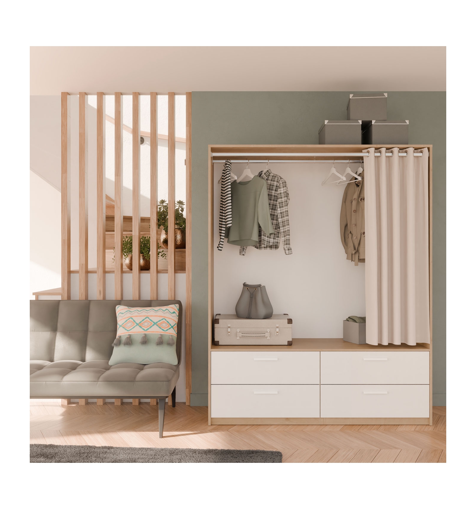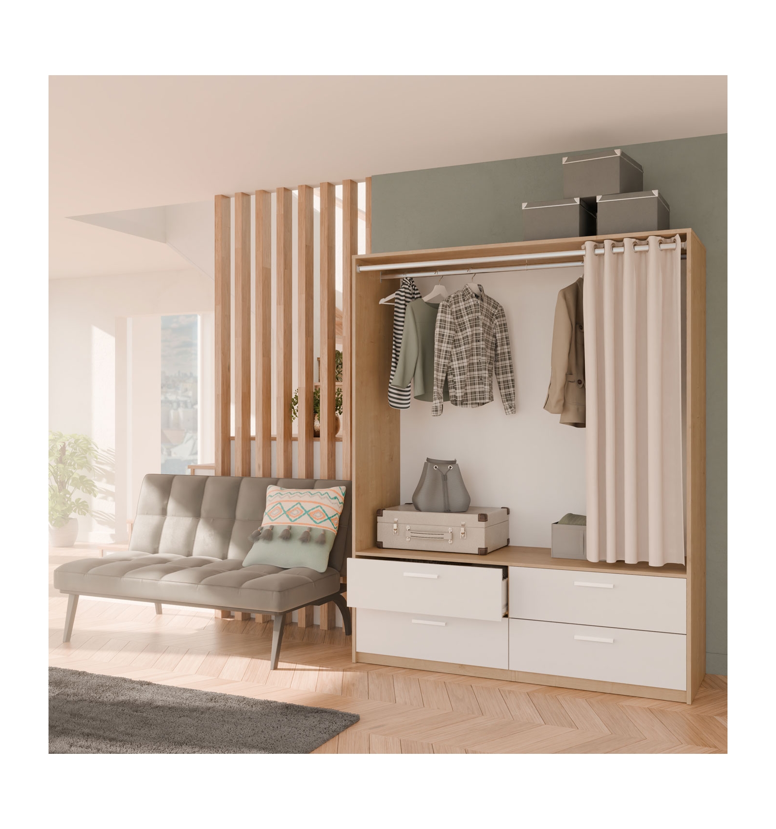 Si buscas una solución de almacenamiento espaciosa, versátil y estilizada, el Armario abierto con cajones Terry es la elección perfecta. Diseñado para quienes necesitan orden y funcionalidad sin renunciar al diseño, este armario combina un amplio espacio de almacenamiento con un sistema de cortina que aporta un toque moderno minimalista.