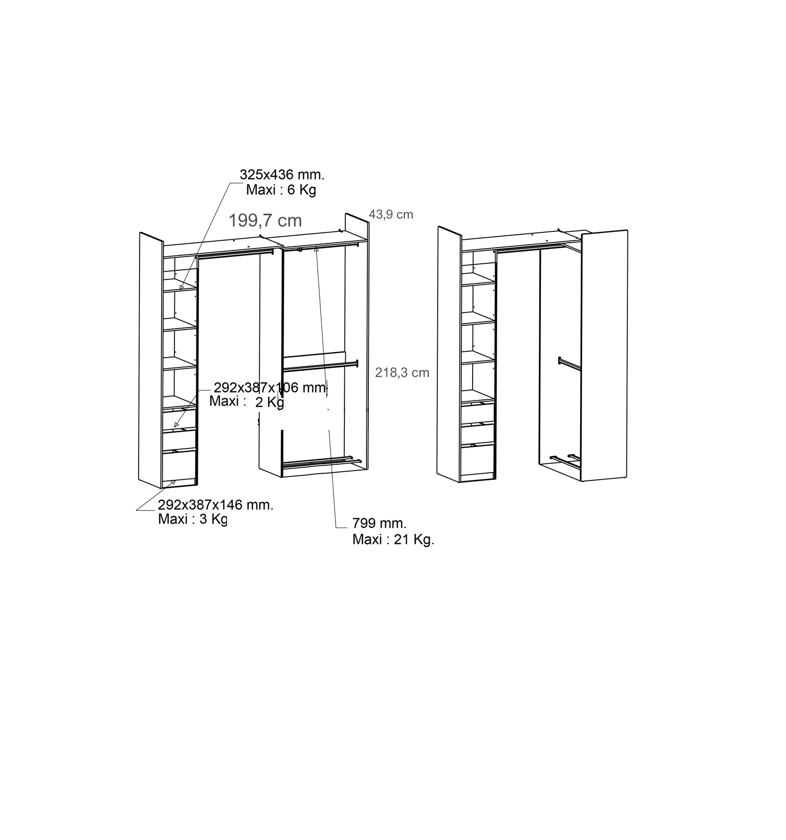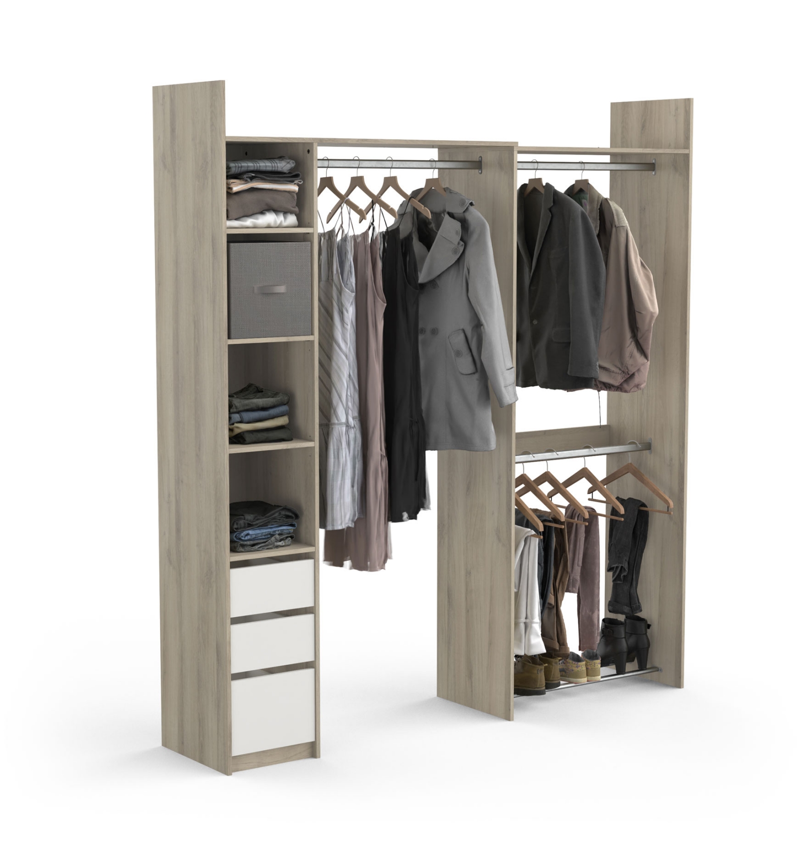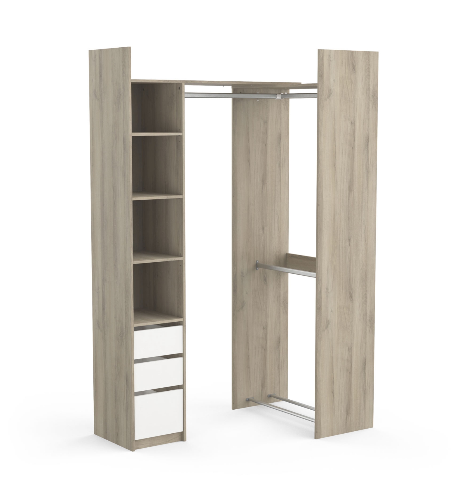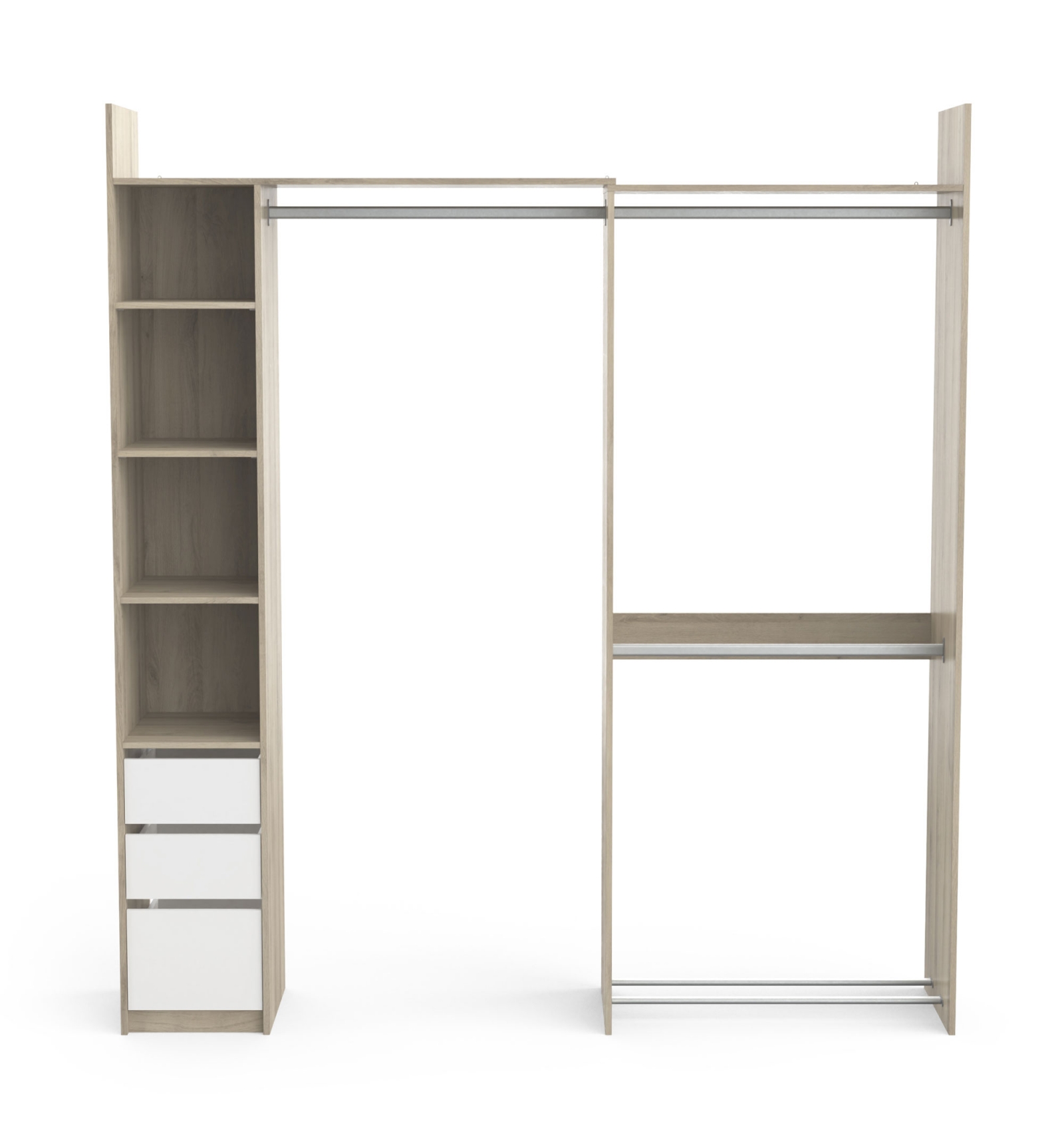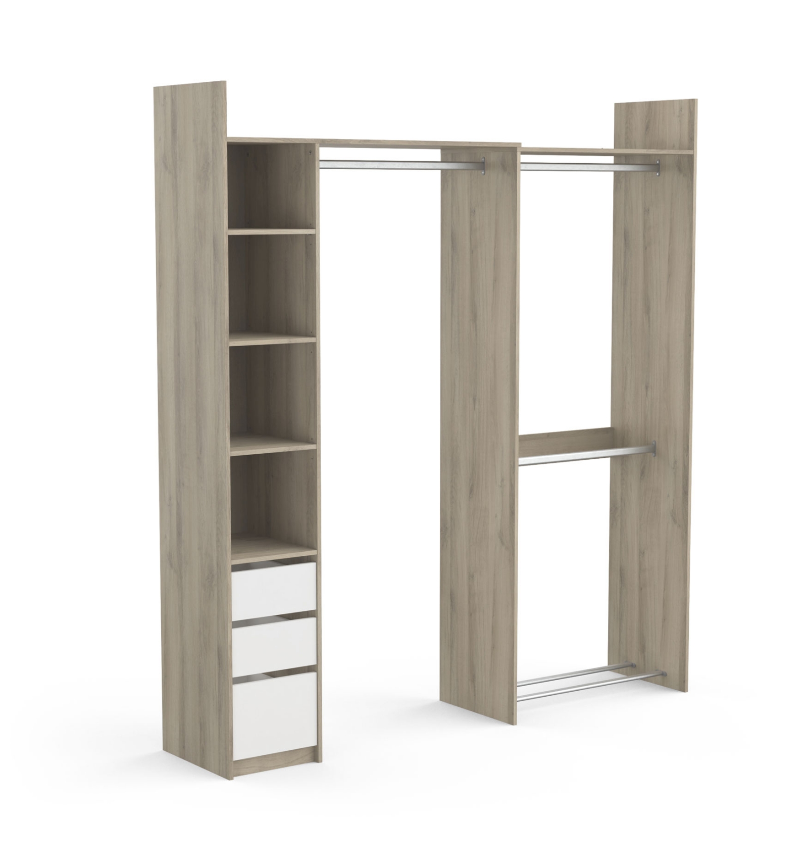 Maximiza el espacio de tu dormitorio con el Vestidor esquinero Swif una solución de almacenamiento versátil que se adapta a tus necesidades. Su diseño abierto te permite tener toda tu ropa y accesorios organizados y a la vista. Además, gracias a su formato innovador, puedes montarlo en dos posiciones diferentes: recto o en esquina, permitiéndote optimizar cualquier habitación.
