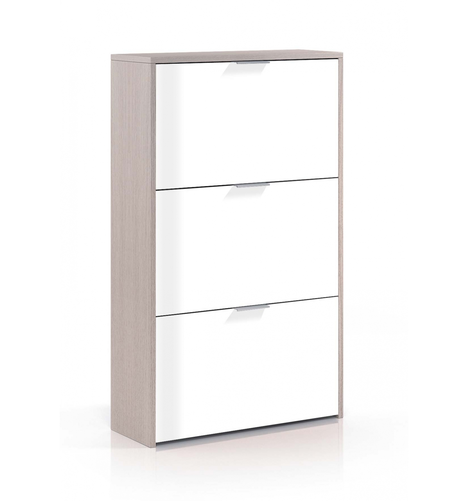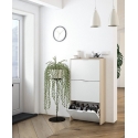 El atractivo y sofisticado diseño del zapatero de 3 puertas abatibles Wind, su combinación de colores blanco brillo y roble y sus medidas reducidas de fondo hacen que este mueble auxiliar encaje en cualquier rincón de la casa.
